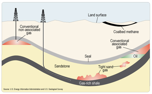 Таким буває газ. На діаграмі вказано традиційний (conventional), метан вугільних пластів (coalbed methane), попутний нафтовий (associated), газ щільних порід (tight) та сланцевий газ (shale)