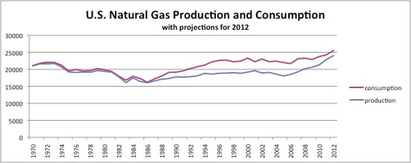 Графік видобутку та споживання природного газу в США. Те, що ці дві лінії почали зближуватися в останні роки - пряма заслуга сланцевого газу